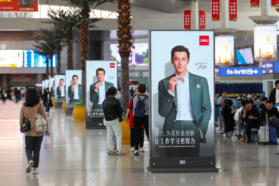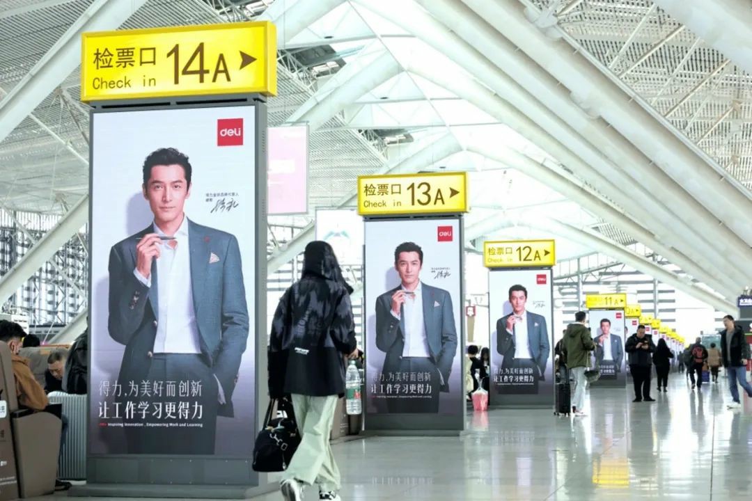 同時,兆訊依據科學的媒體布局,以矩陣式刷屏為得力打造“沉浸式”品牌傳播空間,多城聯動,同頻共振。精美的高清刷屏畫面中,“國民男神”胡歌氣質盡顯,不禁吸引往來旅客駐足觀看,通過一次次的近距離對話,不斷強化得力品牌印象,完成B、C端訴求的有效傳遞——得力步履不停,“讓工作學習更得力”。
